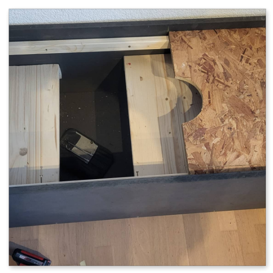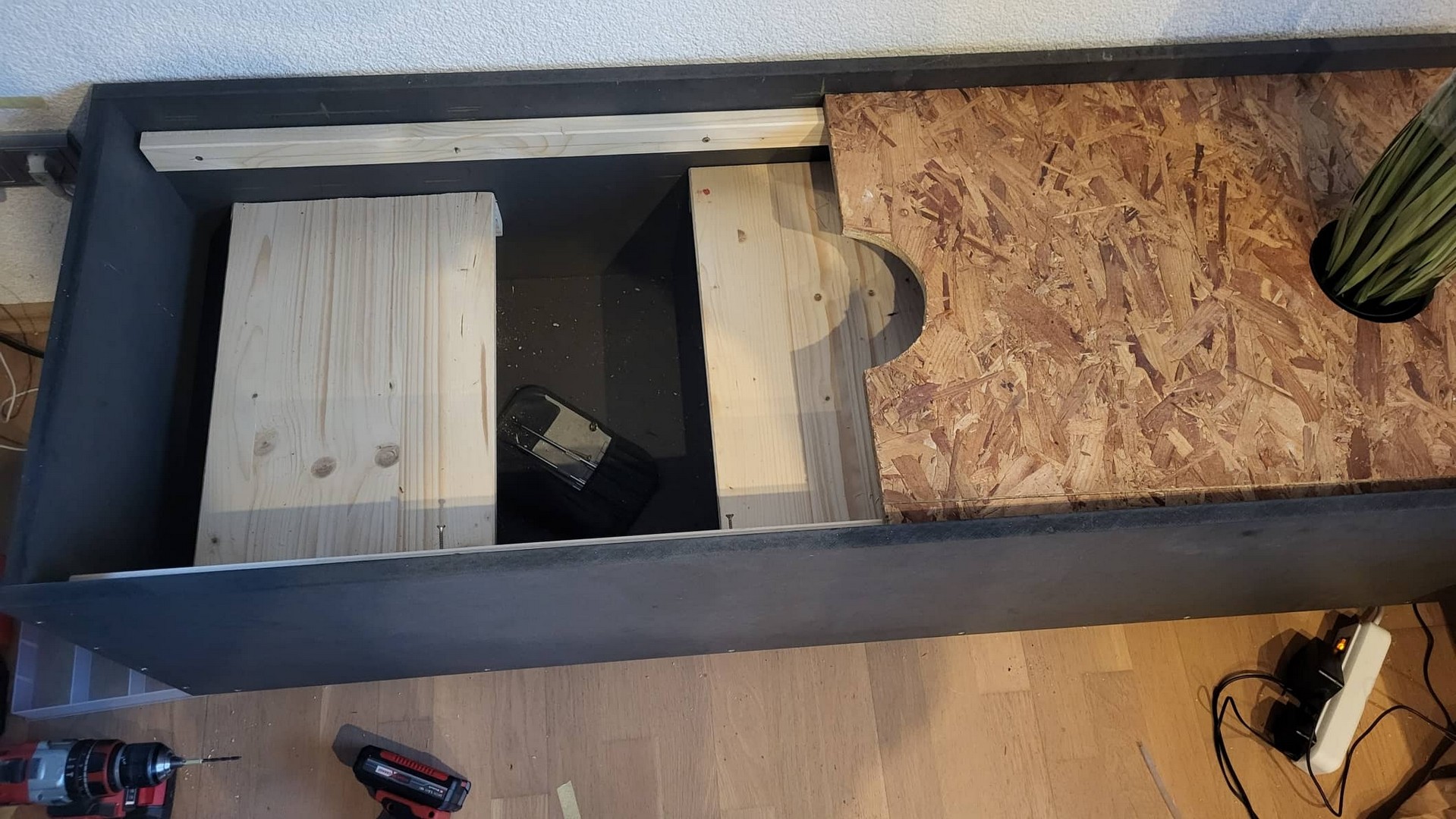 Dr Kasten wird nicht komplett gefüllt, also wurde eine durchgehende Etage montiert und mit der Stichsäge, den Durchmesser für die unterschiedlichen Töpfe ausgesägt.